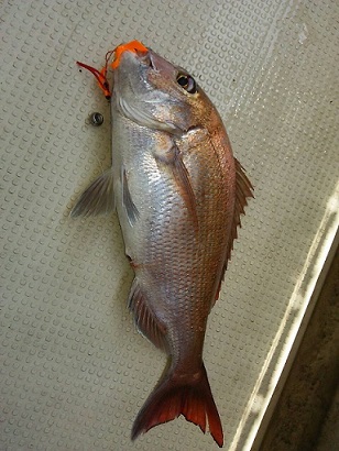 それを見て、思わず30gを借りて、やっているとすぐに小型の鯛がヒットして、次の投入もヒットでばらしましたが、アタリが増えてきて、バラし後の数投目にまたヒットでこちらも小型のきれいな鯛が上がってきました。