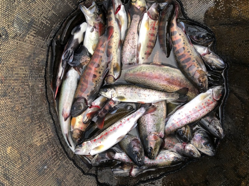 トラウトチームは2g前後のスプーンで開始早々次々ヒット。放流された直後はチャンスです。時間が経つとルアーにスレ始めてくるので魚に飽きがこないようにローテションをするとコンスタントに釣れて当日はブラウン系のスプーンがヒットルアーでした。