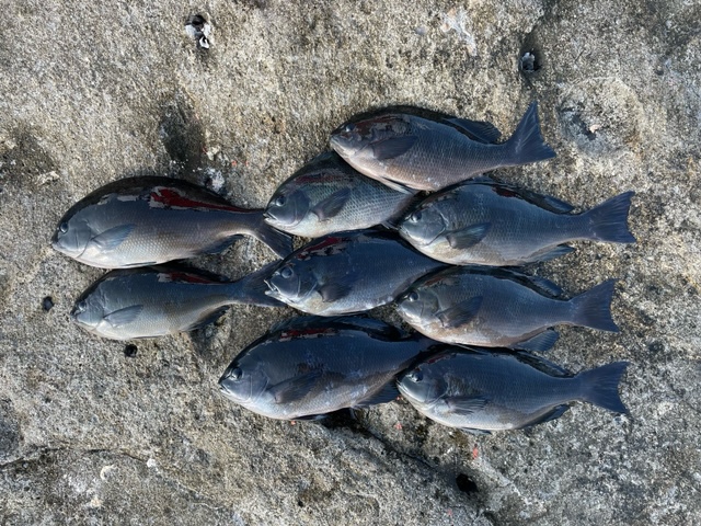 足元に撒いた餌にグレが群れているのを見つけ狙うと、すぐにヒットなかなかの引をしてくれたのは34cmの尾長グレ。