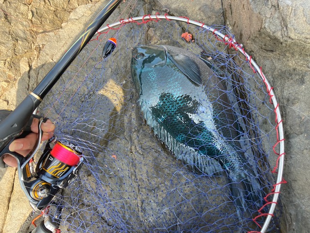 元の場所の磯際を後ろの高い所から狙うとフグの気配も無く良い感じで数等目で浮きが海中へ!かなり強烈な横への走りで明らかにグレ以外の魚ですがかなりの引きに期待しましたが上がってきたのは50センチクラスのチヌ...。チヌ狙いなら良いのですがグレ狙いでのチヌは残念ながら外道でリリース。
