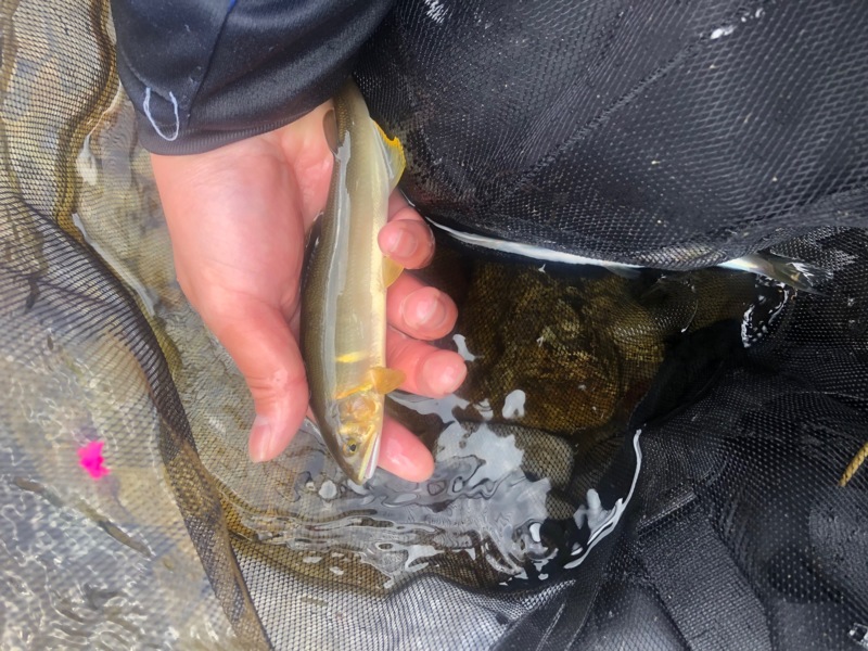 上に歩いていいポイントも見つけるも先日の雨の影響か川底は枝だらけでオトリを消耗。最後は橋よりも下流のポイントで4本追加して雨降りも強くなった16:00に終了しました!