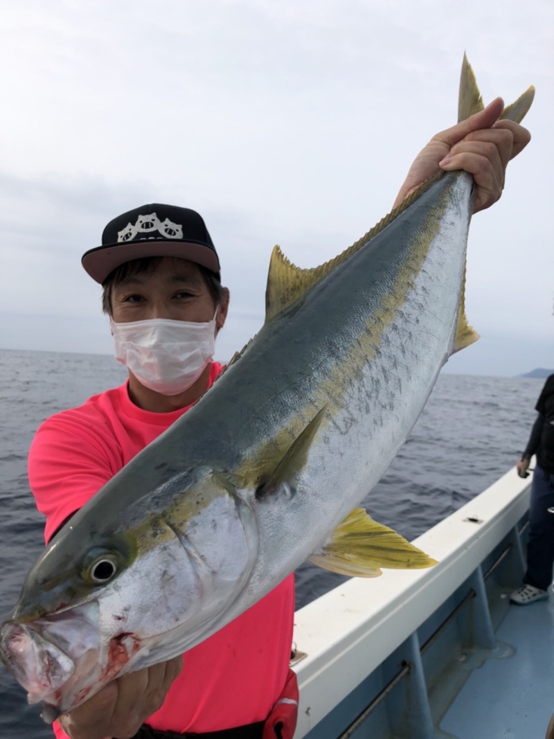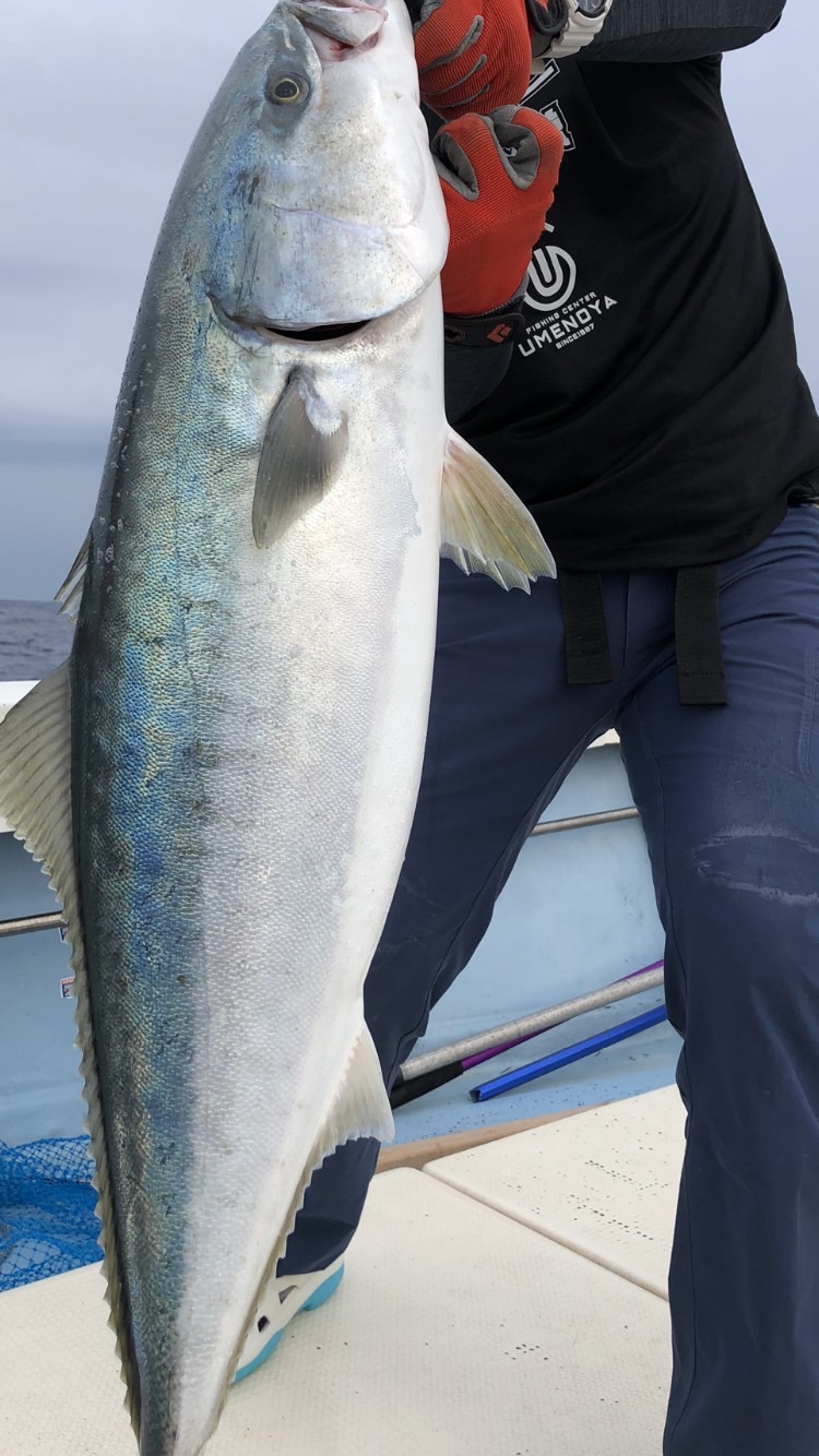 潮がほぼ無い悪条件の中、ひと流し目からヒット!上がってきたのは3キロ強のヒラゴ!(梅乃家さんでは、5キロまでのヒラマサをヒラゴ、5キロ超えるとヒラスと呼ばれます!)