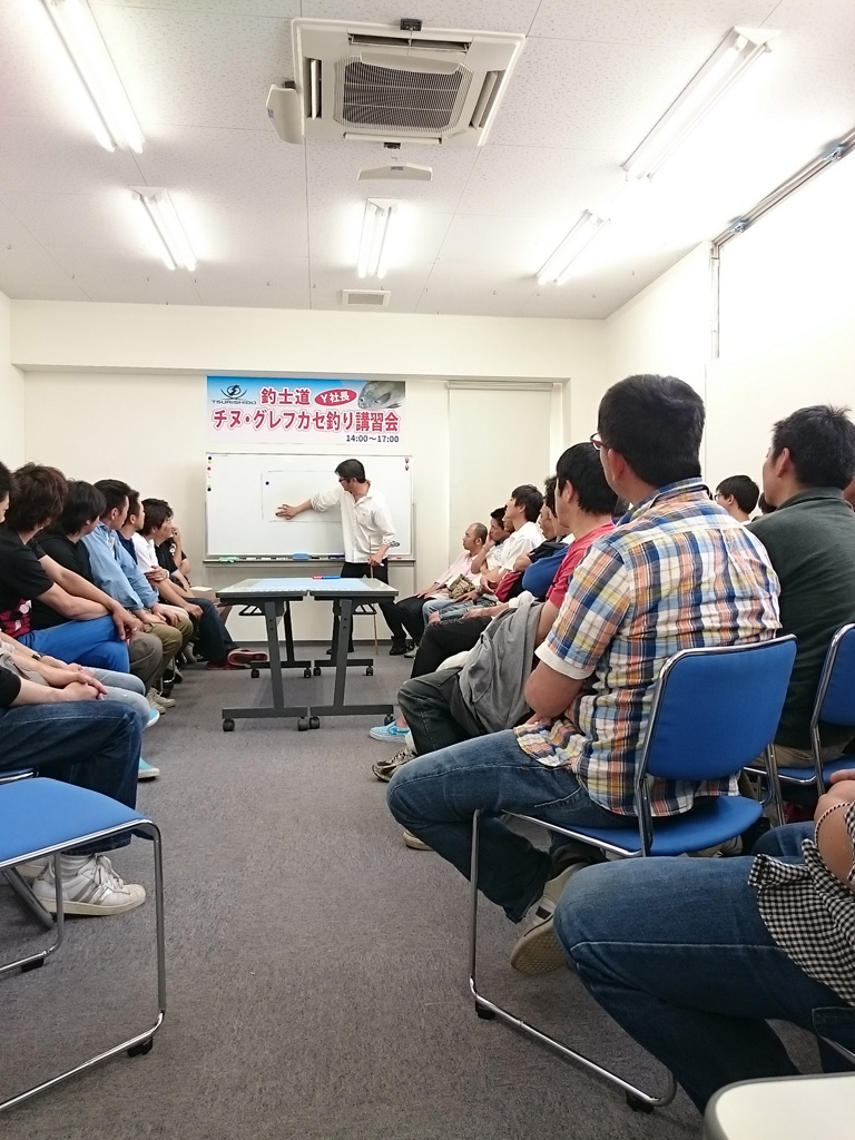 17日14時より釣士道の安田社長による、チヌグレフカセ釣り講習会を開催しています。開始前から席を増設する大盛況!熱い熱い安田社長の講習がスタートしています。