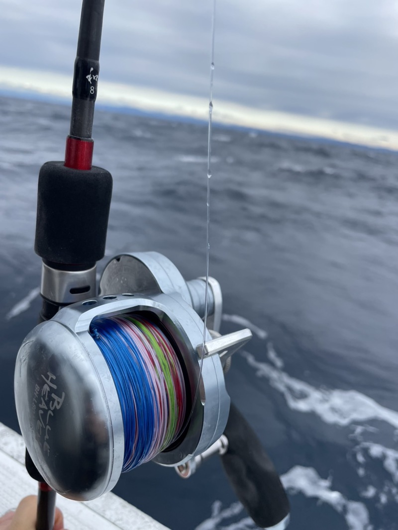 全体的にやはり潮目に付いているようで、150m付近でのヒットが多かったですが、60mに反応が現れるときもあり、反応が上ずるタイミングはなかなか口を使わせるのが難しかったです。200gぐらいのもっと軽いジグを用意してもよかったかもしれないと思う場面もありました。