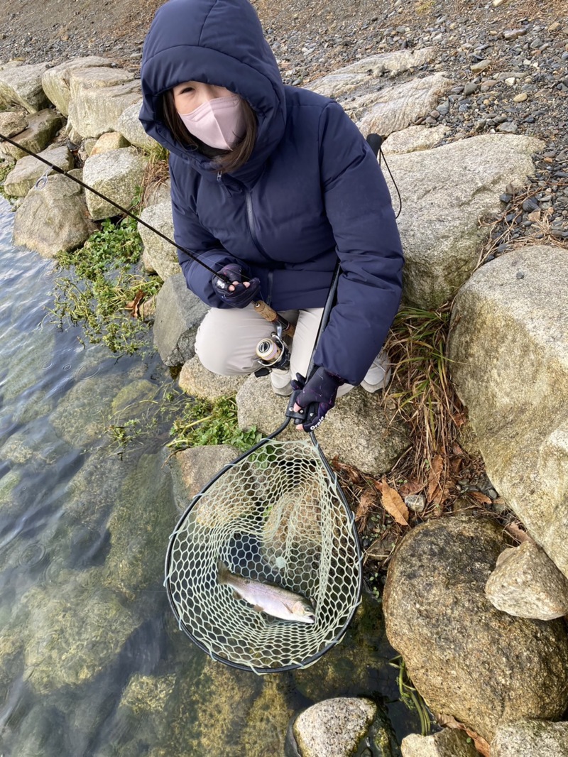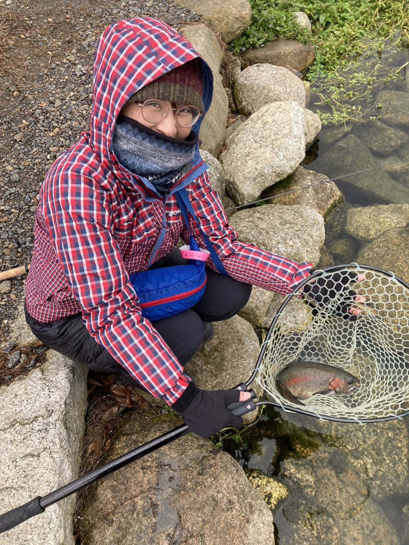 すると幸先よく数投で当たりがあり綺麗なニジマスが上がってきました!