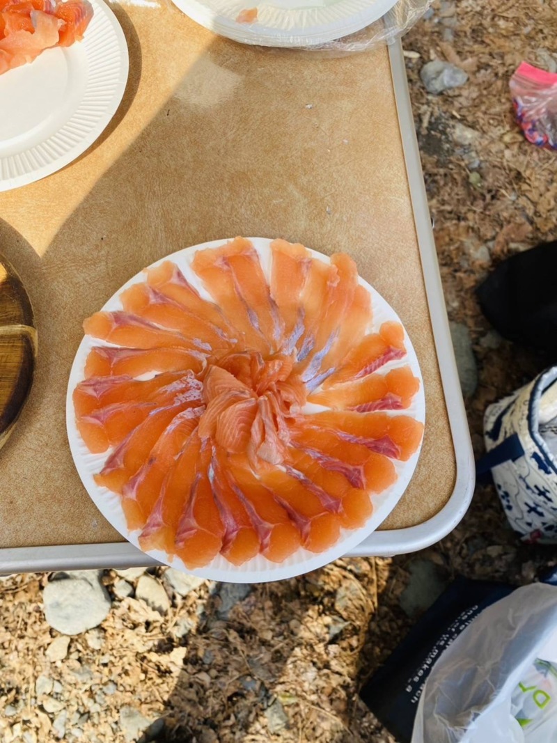 釣り上げたものから刺し身、塩焼き、ホイル焼きに🥰炭で焼いたニジマスは絶品ですよ❗