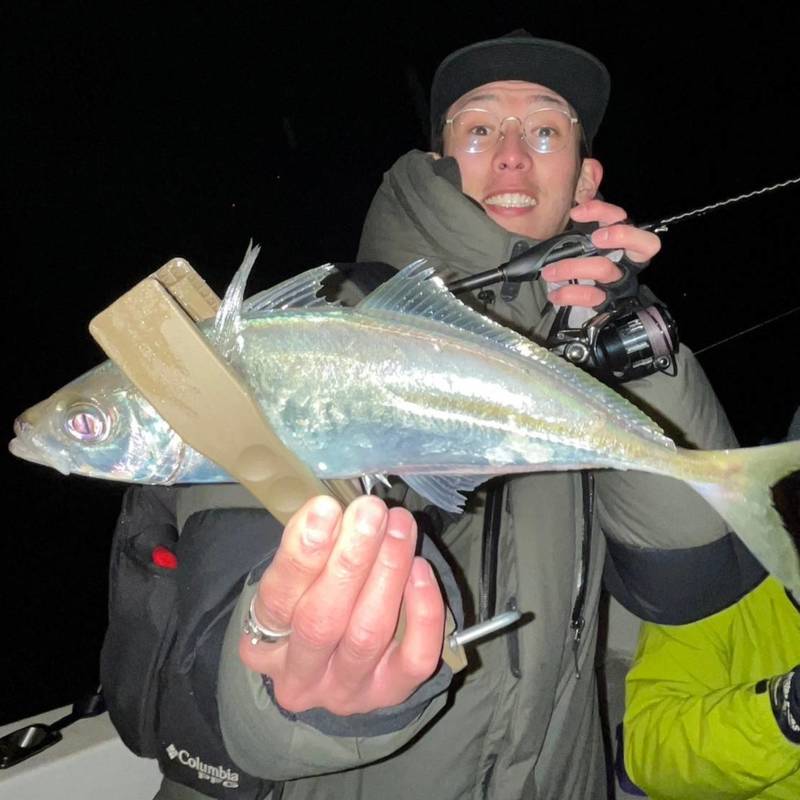 するとそこが大当たり、到着するとすぐに古渡のドラグが鳴り響きます。上がってきたのは30cm強のマアジ!パターンは3gのジグヘッドとロングワームを用いたテンションフォールということで、再現性を求めてリグを変更すると後藤・大野共にヒット!揃って尺アジをゲットすることができました!