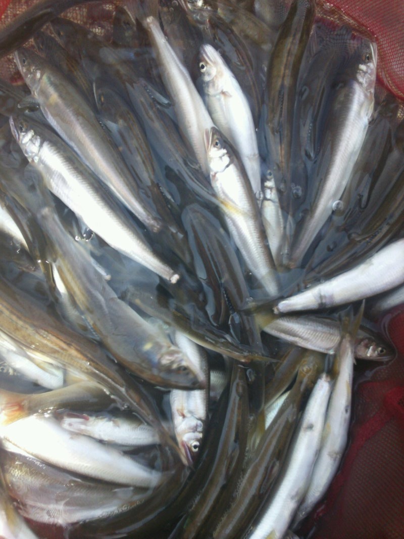 前々日の雨でコンディションが良いと判断して湖西安曇川手前の鴨川に釣行。いつもの161号線上流でAM5時から釣り開始。水量・水色と申し分なく10~16センチ級が入れ食い。竿3.4Mに春瀬工芸底ずるラセンセットで仕掛はパールビーズ1.5号3本鈎。底ずるラセン0.5号。エサは「こませちゃん」。9時頃まで釣れ続き約2.0キロの釣果。残念なことに三分の一は冷水病でした。急な水温低下が原因でしょうか。ハスやニゴイが多くいるので日が昇ると小鮎を追い掛け回すので釣果ダウンします。