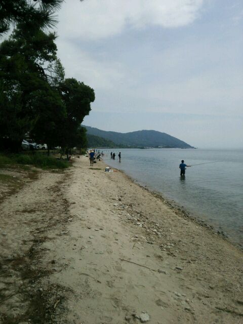 6/7に友人と良く釣れている北小松ビーチに7時集合で釣行。昼のバーベキューがメインですがどうしても小学2年生の子供が釣りたいとのことで3.6Mの竿で釣り開始。エサ付け、取り込みは大人が担当。振り込み、合わせは子供がしました。結果開始から入れ食いで昼をはさんで2時頃まで1.5キロの釣果。恐ろしく良くつれました。