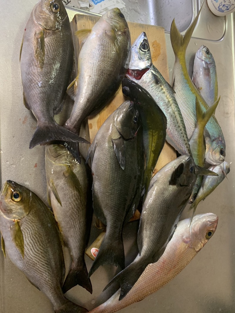 5月6日和歌山見老津沖に春のイサキを狙いに行きました、前日にキンムロアジが釣れている情報を頂いたので、プラスで釣れれば良いお土産なるだろうと楽しみに準備をします、天気予報では午後から雨、しかし天気も持ち、晴れ間も見える感じでした、うねりが入りましたが釣りにはあまり影響はありませんでした。カゴにオキアミを半分入れて、サシエサには浜市のGグリル遠投3Lをセットします、船頭の指示で30mから35mラインを流します。PEラインは3号、クッションゴムは入れてますが、ドラグを気持ちゆるめで仕掛けが絡まないようにゆっくり落とします、ひと流し目から35cmのイサキをゲット、その後食い渋りでウメイロポイントへそのポイントではウメイロはもちろん、ヒメダイや尾長グレ、キビレカワハギなど美味しい魚を次々とゲットしました、ウメイロは41cmありました、最近ではなかなかのサイズとお褒め頂きました、次にキンムロアジのポイントでは、マサバに邪魔されながらもキンムロアジをゲットしました。見老津の海は何が釣れるか分からない所も魅力の一つです。今回は正栄丸さんにお世話になりました。