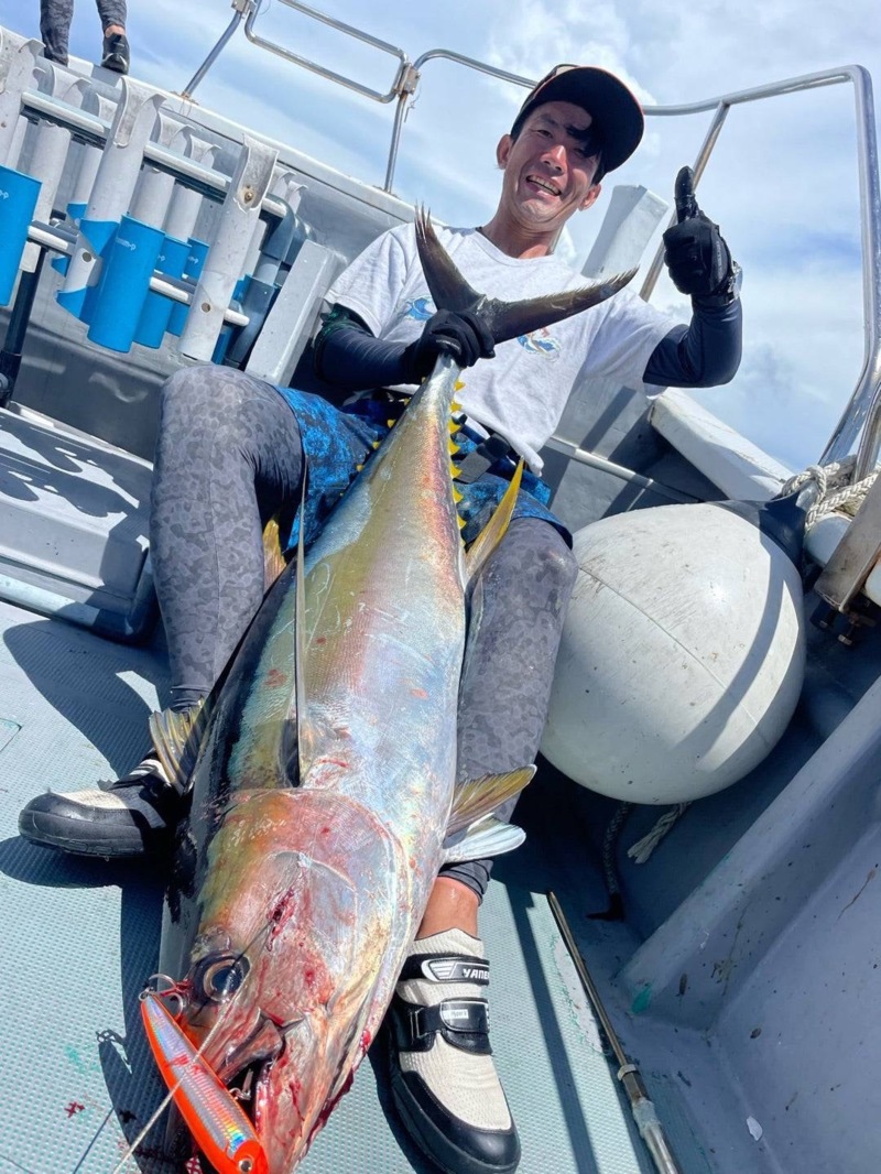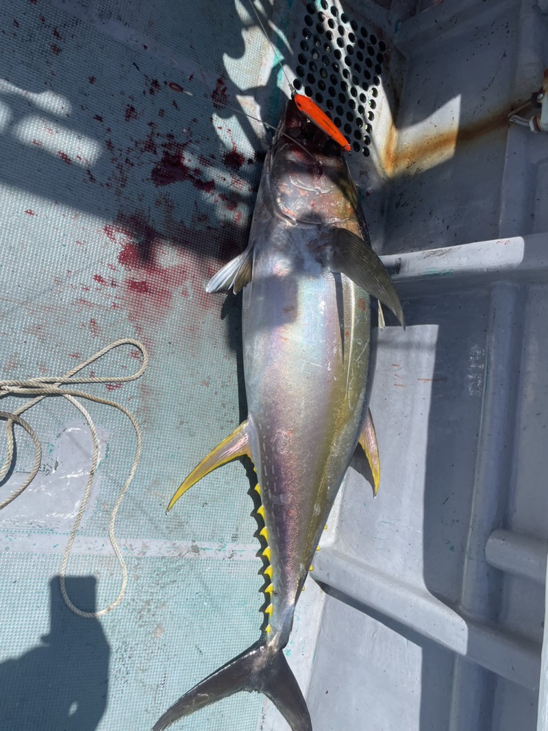 続いてお客様の川﨑様にいいサイズのマグロがヒット!マグロと人の真剣勝負!マグロも人も一歩も譲らない格闘の末、見事に立派なキハダマグロをキャッチすることに成功しました!マグロを上げて確認するとなんと、ルアーが真っ二つに😬それほどパワーが強い証拠ですね。