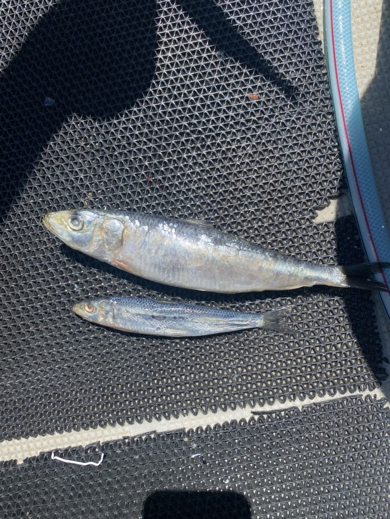 釣っている方の動かし方を見たらほぼ動かさずに、たまにゆっくり巻き上げていました。動かさない方が良いのかと思い、私も真似してみたら漸く小さい前あたりが出ました。半回転だけ巻いて誘いを入れたらガツンと本アタリがすぐ来て念願のヒットです。初ヒットは指4本でしたが、釣れて一安心です。やっとヒットした誘いを見つけられたので続けて同じように動かさずにじっとしているとポツポツとアタリが出る様になりました。しかし前アタリが出た後にしゃくったり、素早く巻き取って追わせようとすると逃げてしまうようです。暫くイワシを齧られて終わりのパターンが続きました。