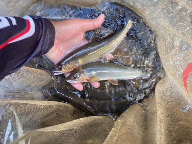 ここのエリアは先日までの雨の影響でまだ水位が高く、流れも強い状況。点在する黒い石周りを探っていくとなかなかの強いアタリ!1匹目は20cm強ですが午前中のポイントの鮎とは追い気も違い、縄張り鮎がいると掛かりも早く朝に入ったポイントの見切りが遅かったと感じました。ここでは大サイズの鮎もオトリに使い大サイズも掛かったので強い鮎の引きを堪能しました。
