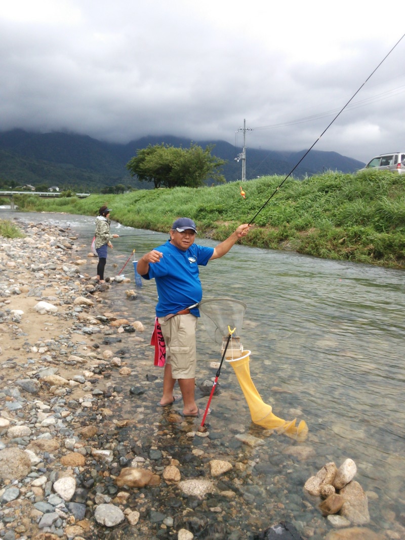 台風後の7/22(水)天候安定していない中釣行。雨は降ったりやんだりの状態。若干増水気味でテレメーターは+25センチ。笹濁りの中上流部の上開田橋の上手に釣り座を構える。水深20~30センチのごろた石が点在するチャラセで川初心者の女性も200匹超の釣果を出す。まさにマシンのように釣りまくっていました。浅瀬なので底ずるシンカー0.2号で流すたびに毎回のアタリ。あたりが多すぎて3本針より2本針の仕掛けのほうが効率が良かったです。台風で下流域のやなが空いていたので銀ピかの小鮎が多く遡上していました。