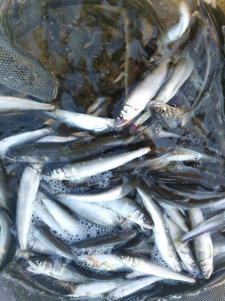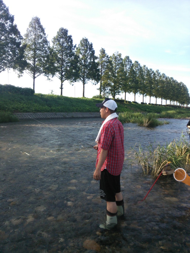 知内川メタセコイア並木前に5時集合で釣友5名と京都店佐伯店長、春瀬工芸の太田氏も参戦しての釣行会。佐伯店長は出勤前の釣行。テレメーター+15センチの絶好の水量。水色もよく小鮎がたくさん跳ねている。メタセコイアの並木前の堰堤下で京都店佐伯店長が春瀬工芸の太田氏にアドバイスを受けて入れ食い。8時までの釣果は軽く100匹以上。他の釣友も初めから猛ダッシュで超入れ食い。その中18.2センチが飛び出した。全体的には遡上したての15センチまでが大半。雨が降るたびに知内川の水色は小鮎の魚影で染まっていく。
