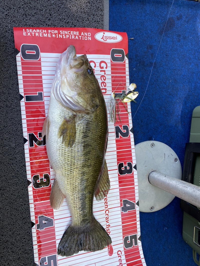 すると、風が吹いてきてウインディーサイドにクリスタルS1/2oz(ノリーズ)をキャストすると良型のバスがヒットしました。
