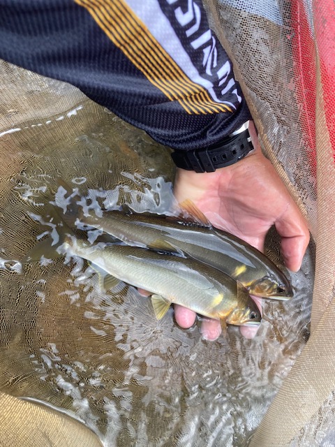 場所移動も大変なのでウロウロと釣り下がっていきますがたまに釣れる程度。下流の本命ポイントに近づくと他の釣り人の姿が見えたので元の場所に戻っていき普段はあまりやらない超浅瀬で泳がせると良型が多数反応! 誰もやらなさそうな所を釣っていき13時までになんとか20匹確保。