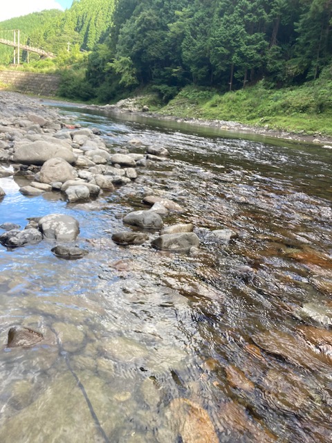 オトリ店で他の客さん達とどこがいいのか?深いところかチャラ瀬か?『追いが無ければさっさとポイント移動や』など長話をして広井原で釣ることに。道路から見るとすごく釣れそうな感じでしたが いざ釣りを開始すると反応ナシ...。色の良い石まわりを丁寧に狙うも無反応...いろいろ狙うがなかなか掛からず20分ほどたってようやく1匹目。