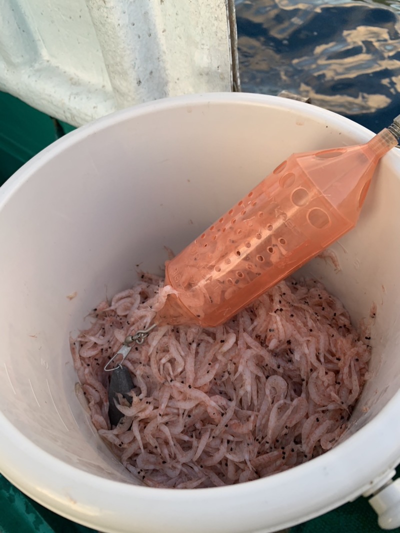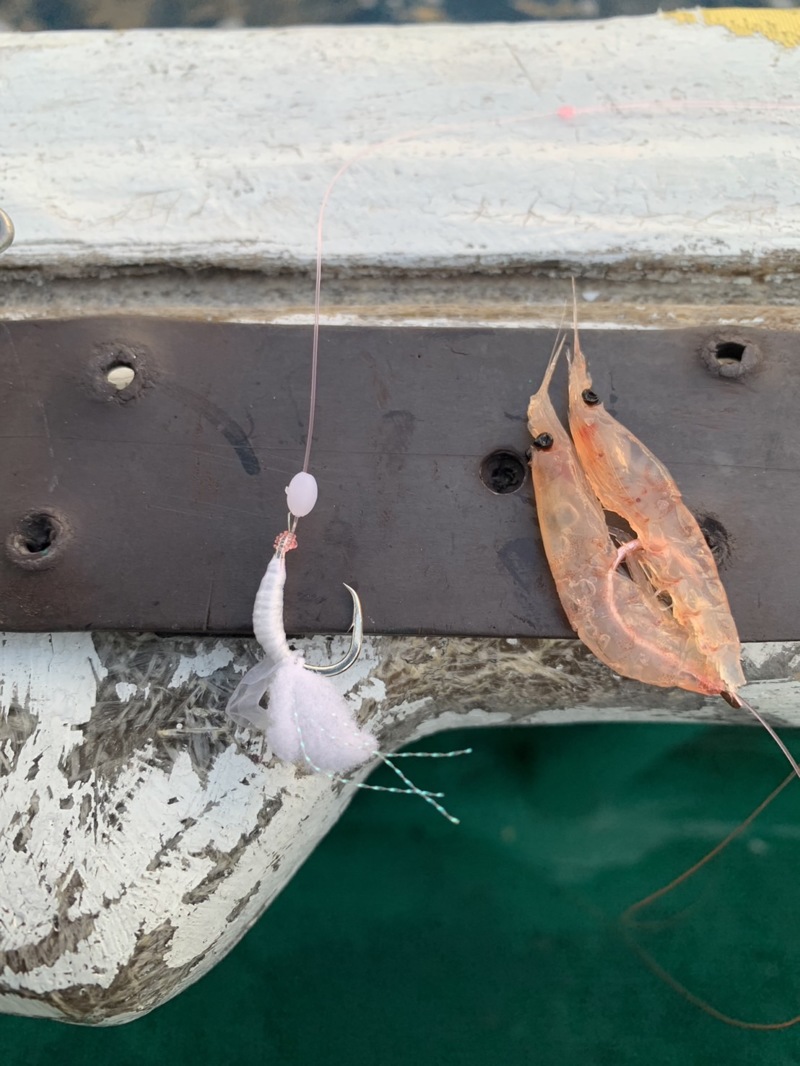 見老津でシマアジが好調だと聞き、正栄丸さんにおじゃまして来ました、16時に港で半には出船するとの事、準備をして船頭さんにドラグの調整の確認をします、いろいろ下調べをして、この調整がとても大切で聞いていた話より少し硬めでしたが準備を済ませ、今回はハリス6号の2本バリ、手前に白ウーリーをつけました、ポイントまで10分も走りません、見老津の船が丘を向いて並びます、17時になってサニーカゴに半分ほどオキアミを入れて投入です、30m底で3m底を切ります、こませを軽く振ってあたりを待ちます、ブルブルと穂先にあたりが伝わり、鯖のような動きと思ったらムロアジでした、そのからムロアジしかあたりません、1時間経ってもムロアジ、無線でもシマアジの釣果が聞こえてきません、アンカーをあげてポイント移動、またまたムロアジです、4回ポイント移動しましたが、本命のシマアジの顔を見ることは出来ませんでした。最後にアンカーをあげて流しながら、イサキやメイチダイ、友人はヤイトカツオやカマスなど釣り上げてました、やはり幻の高級魚、またチャレンジしたいと思います。サシエにはGグリルの2L.3Lを使用しましたおすすめです!!