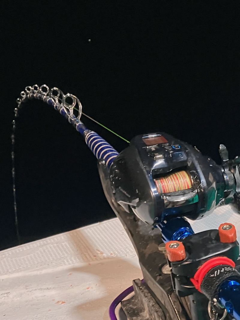 ドラグ緩め、電動高速回転で対抗。時間を掛けて魚をバテさせ釣るイメージ。バテた頃合いで手でPEを手繰り、電動リールの巻き上げをサポートしてやるとスルスル浮いて来ました。