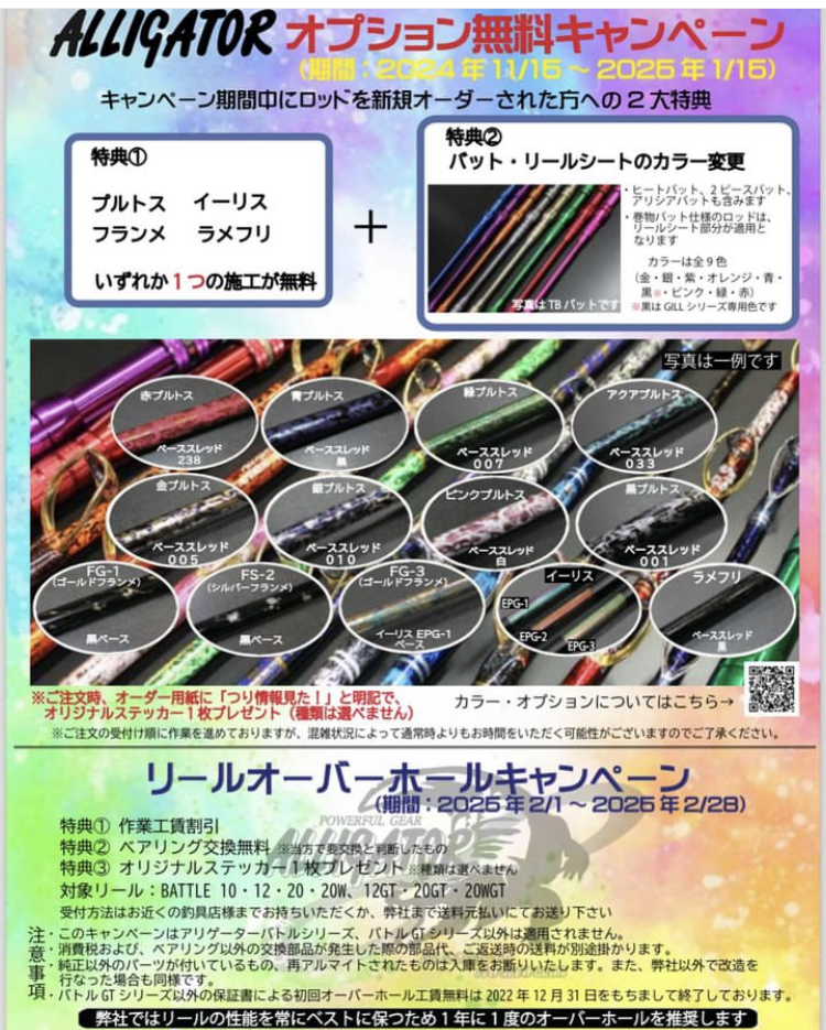 11月15日から始まるオプション無料キャンペーンを受け付けてますので、アリゲーターロッドオーダーをお考えのお客様、是非当店海竿担当までお申し付けくださいませ。