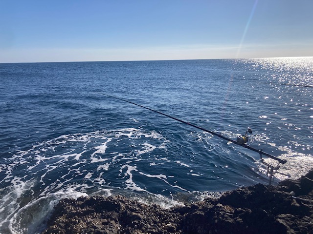 投げるたびに反応はありますがほとんどがウツボで毎回仕掛けがだめになる最悪の展開。我慢して続けていると60mほど遠投で狙っていた釣武者の遠投竿『FUJIN』が本命らしいアタリをとらえましたがすぐにエサのサザエを放してしまいました。