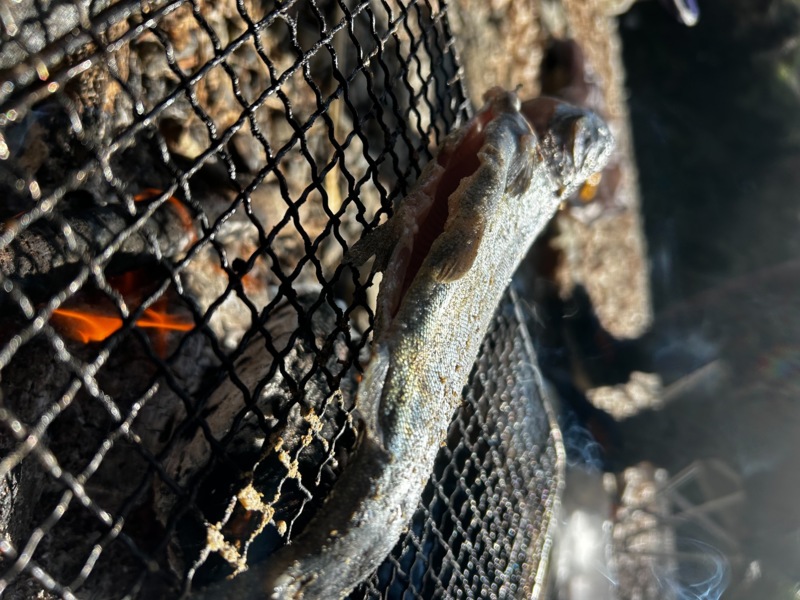 放流直後の活性が落ち着きアタリが減ったため、釣り場を休めるのも兼ねて釣れたニジマスを焼いて食事休憩😋