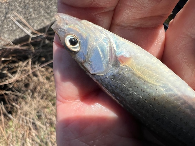 昼間なのに1投目からアタリがあり10cmのレギュラーサイズが。