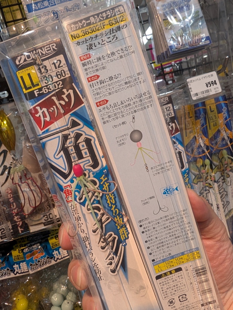 20号のオモリを二つ付け、カットウ仕掛けに赤エビをセットしてゲームスタート!