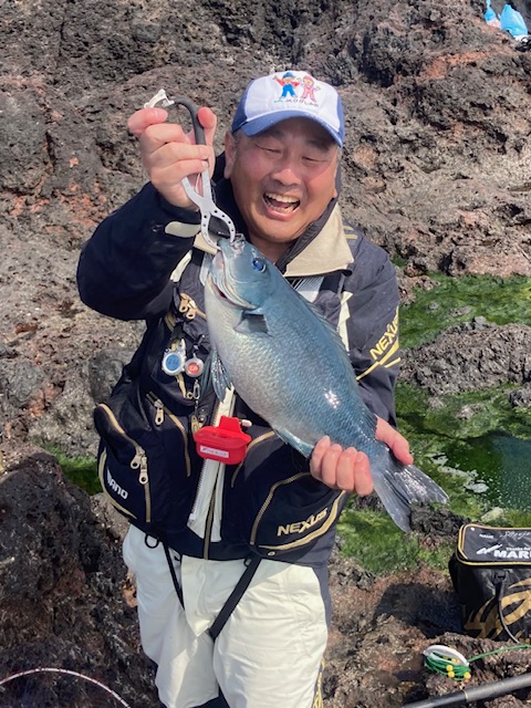 出船前にドッキー船長に挨拶をしていざ出船! 1時間半ほどしてポイントに到着し2名ずつ分かれて渡礁しましたが前日の大きなウネリが残っていて釣り開始までアタフタしましたがなんとか釣り開始しますが横からの強風とかなり速い潮とウネリに苦戦しましたがウネリが落ち始めると良型のグレが釣れだし一安心。