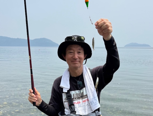 比較的浜から数メートルに小鮎の跳ねが見られたのでウエダーを履いて短竿でやりました。