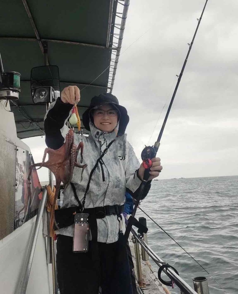 出船してポイントに着いてしばらくは、曇り空で釣りやすい気候。タコも順調に釣れ、沢山釣れそうな予感でしたが。