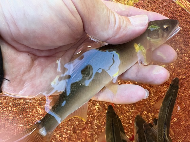 10センチ前後の新しく登ってきた個体が多く混じり、この河川で最大級の18センチまでの追星黄色いアユが数匹。