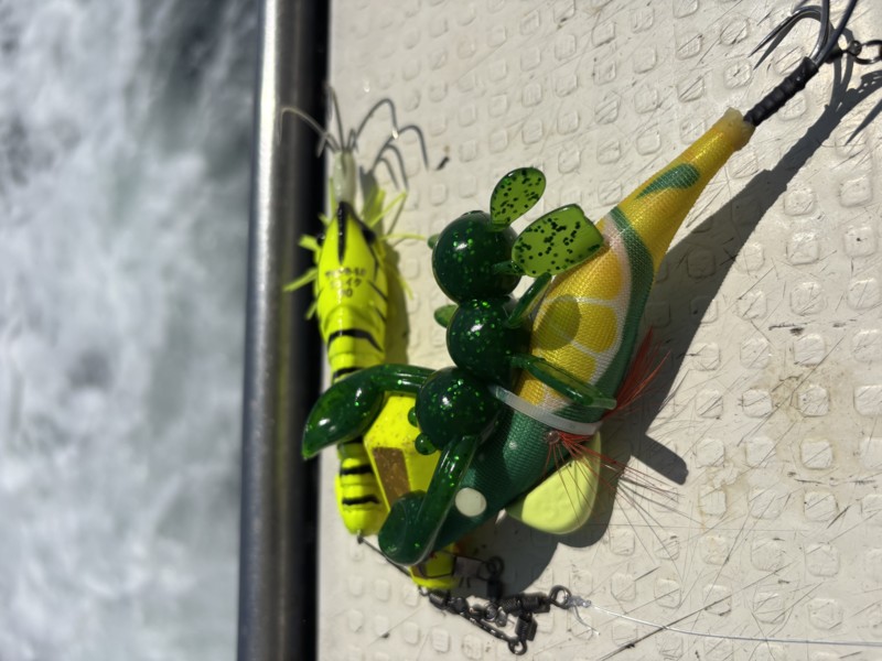 バレーヒルの玉三郎が釣れるとのうわさを聞き、ピーマンカラーで試しているとワームが取れて、針にチョンがけ状態になっていて・・・笑