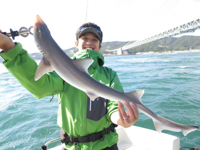 さすが明石、80号でも底取りが難しい・・・。2流し目ぐらいで竿からの違和感を感じとり、ゆっくりと持ち上げるとあきらかにエサのアジではない動きが伝わってきます。すかさずアワセをいれて、ノマセ初HIT!!重たさを感じながらゆっくり上げてくると、なんと!!サメ!!!!岡本自信、初めてのサメだったのでテンション上がりましたw