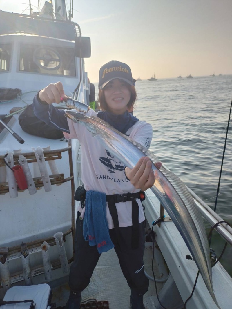 2日目は昨日と少し様子が違い、潮止まりの時間までポツポツとアタリがありました!1本目は回収中にいきなりガツンとアタリがあり、そのままゲット。2本目は暫くして微速ただ巻きで誘うとコツンとアタリがあり、ストップさせると大きく竿が曲がったので合わせると指4本無いくらいのサイズをゲットしました。同船された方もポツポツ掛けていたので1日目より魚の活性はあるように感じました。しかし潮止まりになるとアタリが無くなりました。こまめにシェイクしたりワンピッチで誘うと小さい太刀魚がたまにヒットしていますが、今回は大物狙いの為微速ただ巻きで粘ります。しかしこのままアタリも無く終了時間に…。