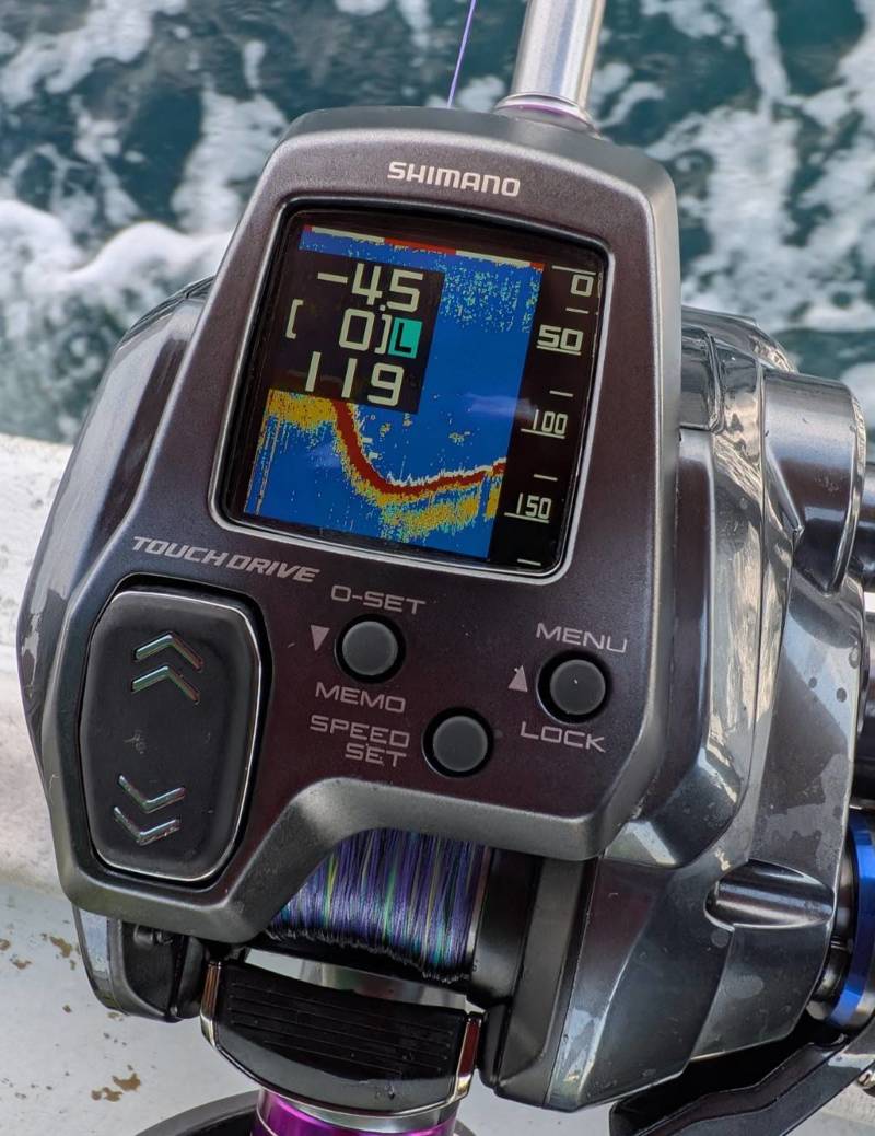 先に出たフォースマスター600にも付いていますが、『タッチドライブスピードロック』という機能なんですが、任意のスピードを設定しておくとタッチドライブを押すと一発でそのスピードで巻き上げ、さらにタッチドライブを強く押し込むと押してる時だけハイスピード、離すと任意のスピードに戻る機能となっているんですが、これがタチウオにバツグン!!
