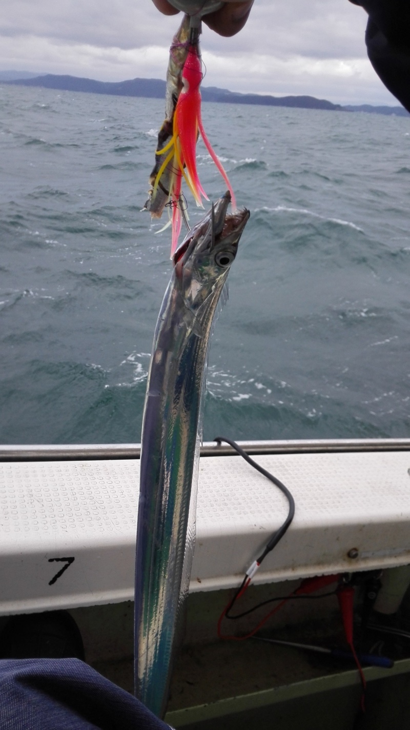 昼近くになると波風共に穏やかになり、船内で良型タチウオが次々ヒット。