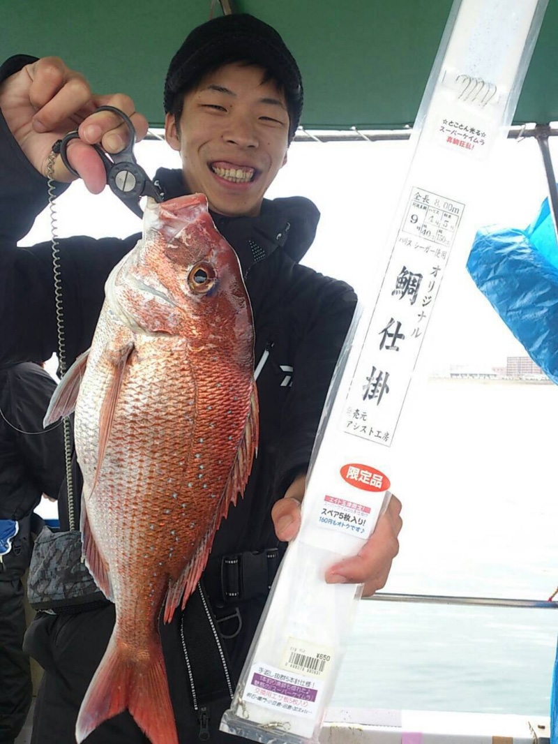 乗っ込みマダイを狙いに明石に行ってきました。釣り方は落として巻くだけのタイサビキ!朝は潮が早く長い仕掛けに手こずりましたが徐々になれてきて水深30Mの浅場のポイントでまずは迫田が良型マダイゲット!続いて八尾にも綺麗な天然良型マダイがヒット!2流し目に女性スタッフ尾畑にも50センチ超えるマダイが!!お祭り騒ぎの中取り残された脇阪…そのポイントでアタリが連発していたのでそこで粘ると遂に脇阪にもヒット!船中全員安打の好釣果!!今年の明石のマダイは魚影が濃いです!そしてオススメの仕掛けはアシスト工房の『職人マダイ仕掛け』5本針でオレンジとケイムラが最高!ビギナーから女性誰でも楽しめますよ!