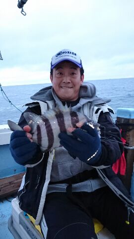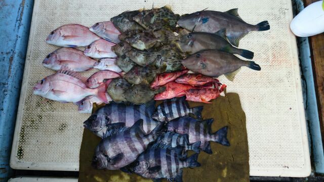 前日からの雨も上がり、なおかつ数日前から食いが本格的になってかなり期待大で6時半に淡路島の土生港を出港!朝一番は沼島の北のポイントに入り、少し流すと待望のヒットとなり30cmクラスが上がる。さらにいい引きを見せたのは35cmオーバー!これからというところでしたが、チャリコの猛攻と少しうれしい良型のウマズラのみで本命はなかなか上がらず、12時の納竿までに4枚を追加したのみの厳しい状況でした。日によってかなりムラのあるサンバソウ釣りですが、予約もなかなか取れないこの時期の人気の釣りです。また、食味も最高で気軽に狙えるイシダイ釣り、1月いっぱいまでがオススメです!!